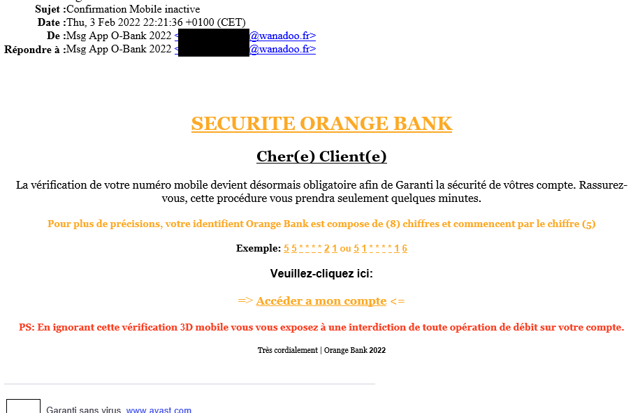 Les mails de phishing, sont toujours un vecteur puissant de piratage auprès de nos clients. Dans le cas ici présent, les escrocs sont tombés un petit peu à côté de leur cible, en contactant un de nos clients avec un faux mail du service bancaire de l’opérateur français Orange, chez qui, bien sûr, notre client n’avait pas de compte :