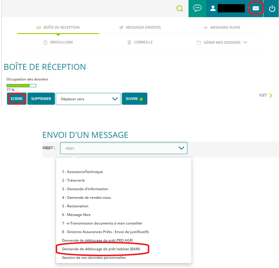CLIQUEZ SUR "ÉCRIRE" ET CHOISISSEZ "Demande de déblocage de prêt habitat (BAM)"
